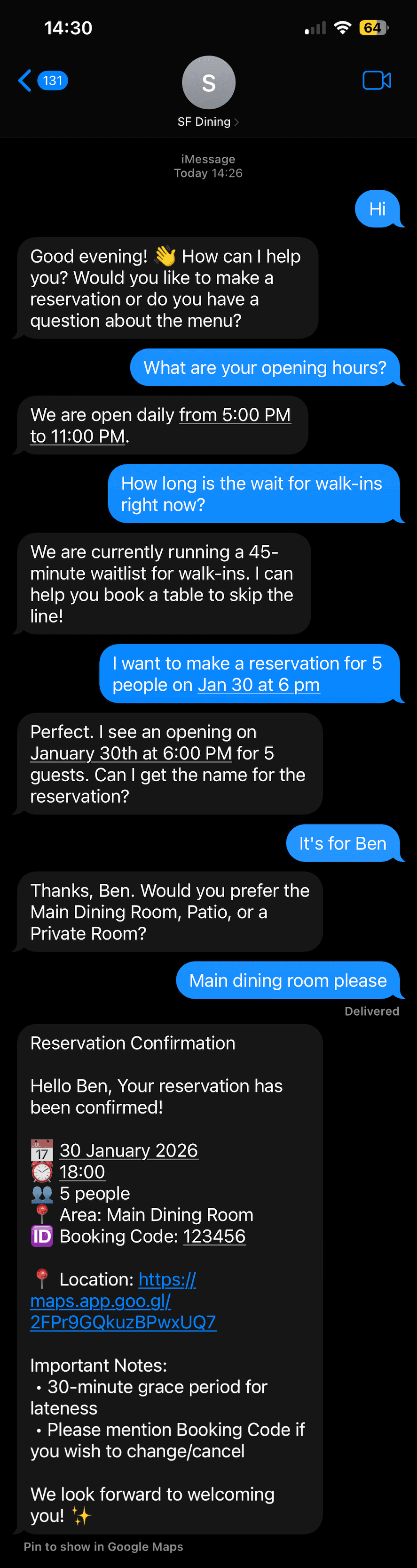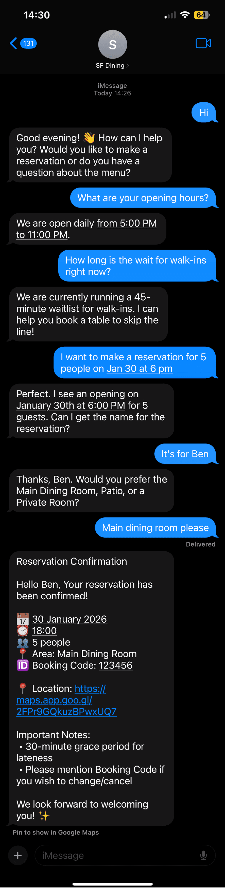The moment a guest requests a table, Darva checks your real-time availability, handles conflicts, and locks in the booking. A branded iMessage confirmation is sent instantly.